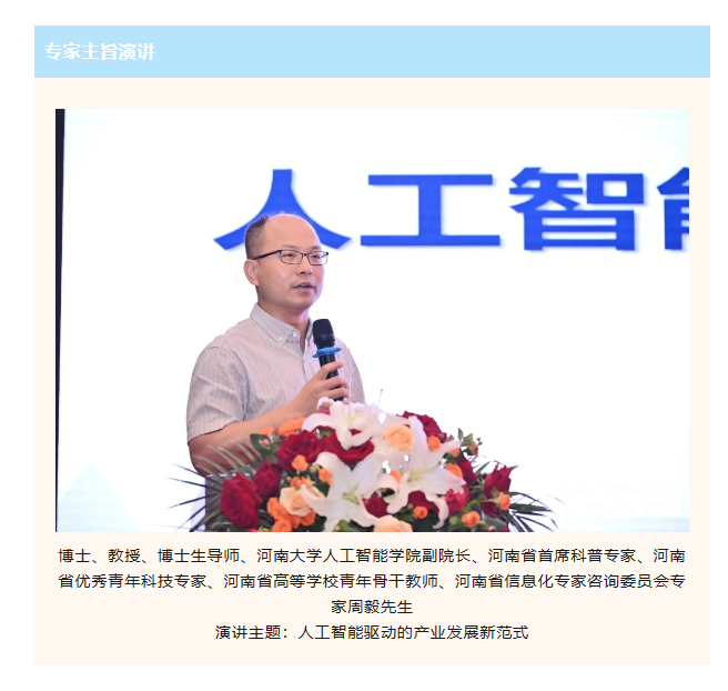 博士、教授、博士生导师、河南大学人工智能学院副院长、河南省首席科普专家、河南省优秀青年科技专家、河南省高等学校青年骨干教师、河南省信息化专家咨询委员会专家周毅先生带来“人工智能驱动的产业发展新范式”的主旨演讲。