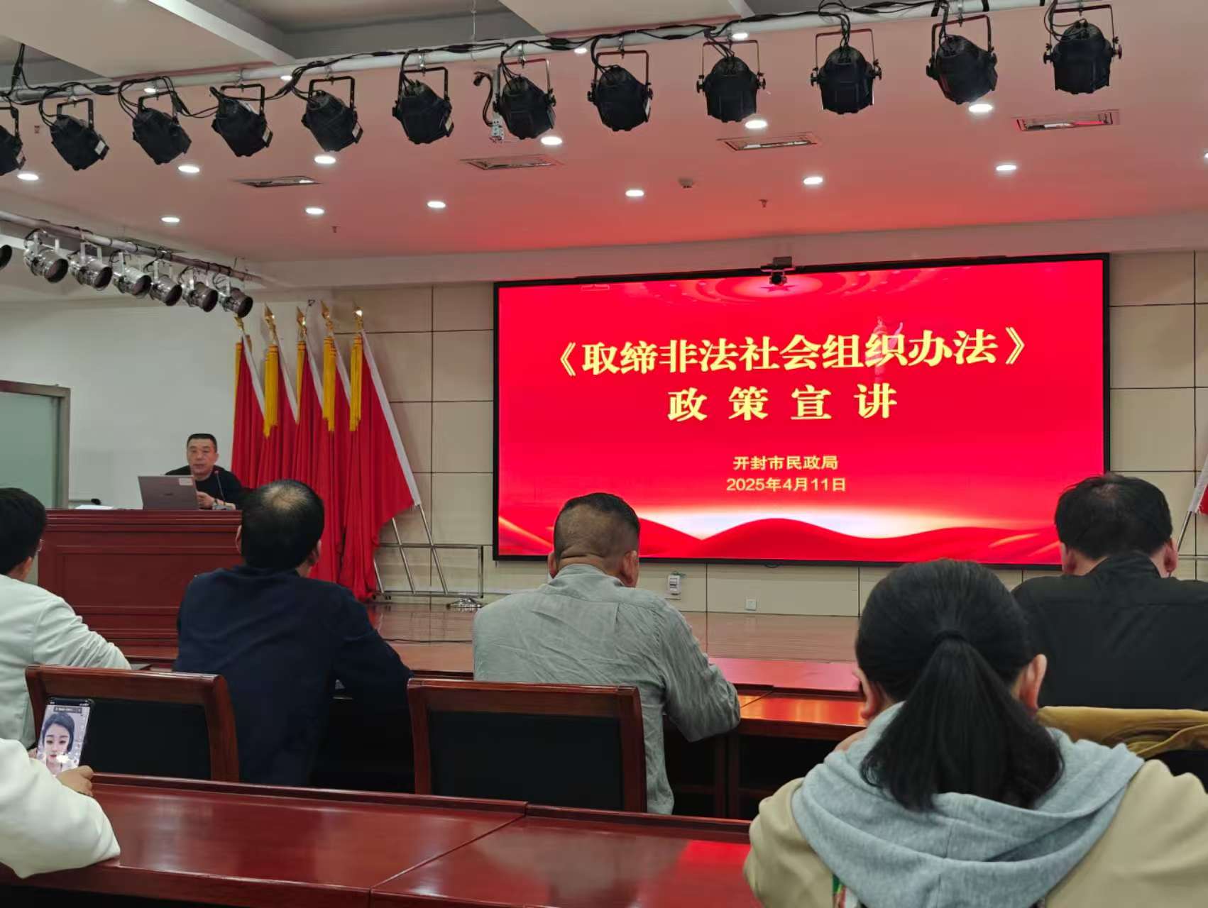 2025年4月11日,开封市安防协会副秘书长霍克代表协会参加由开封市民政局举办的《取缔非法社会组织办法》专题工作会议。