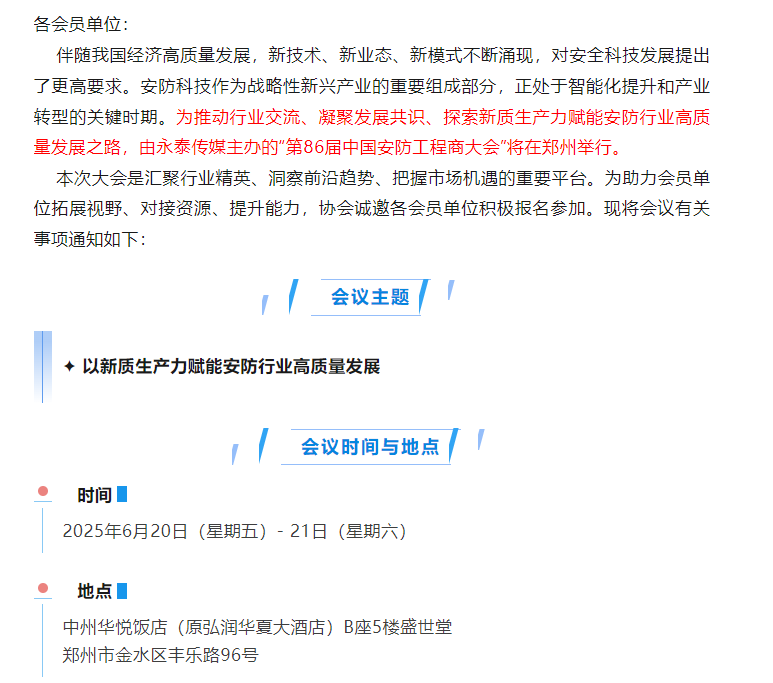 关于组织会员单位参加“第86届中国安防工程商大会(郑州)”的通知