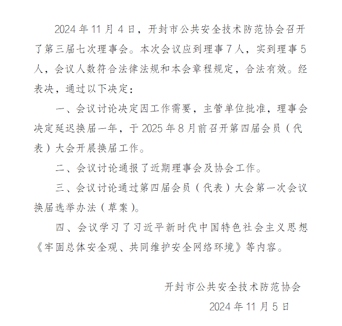 开封市公共安全技术防范协会第三届七次理事会关于换届选举会议纪要